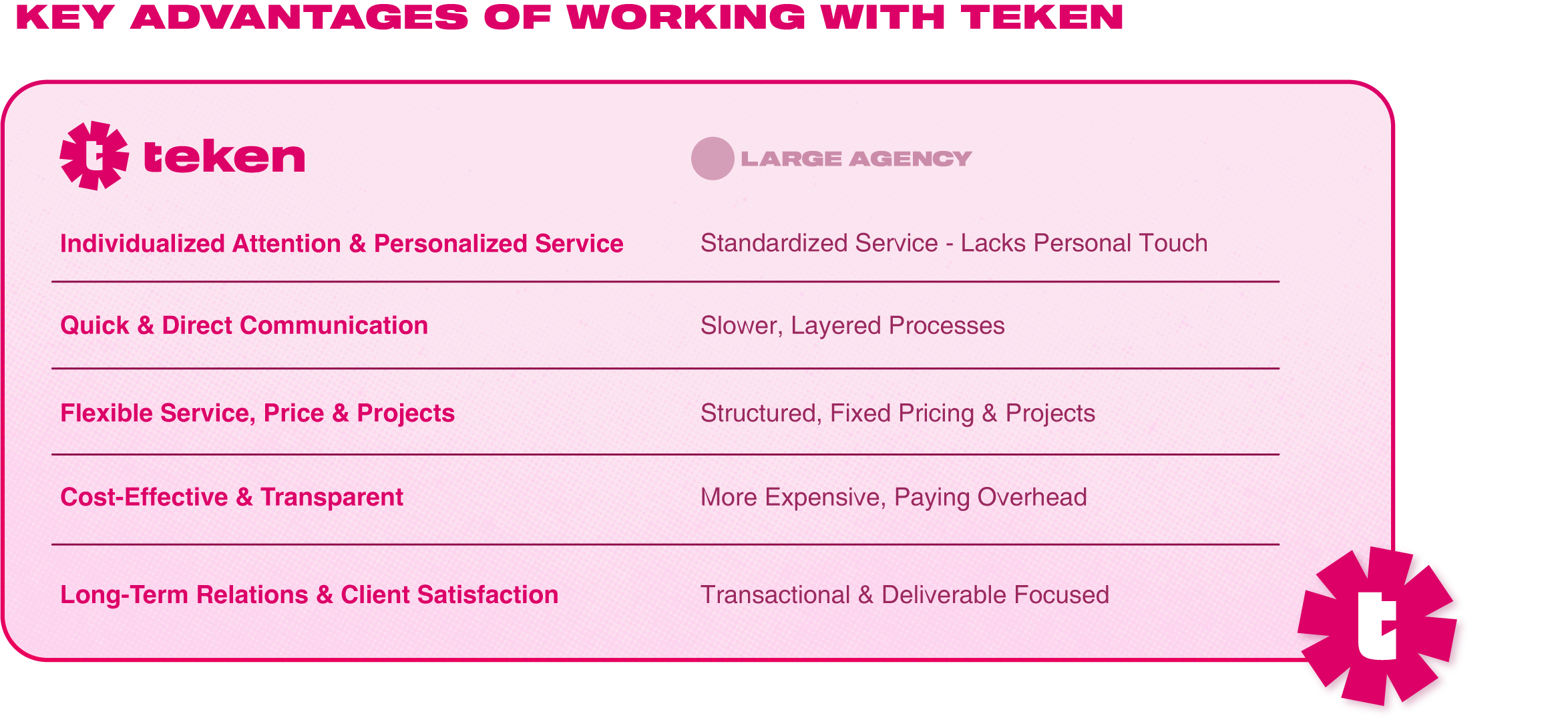 I run a one-person team at Teken. While I may not provide all the services of a large agency, I can connect you with trusted small teams who are experts in areas I'm not. This network approach ensures you still receive expert service in every discipline.