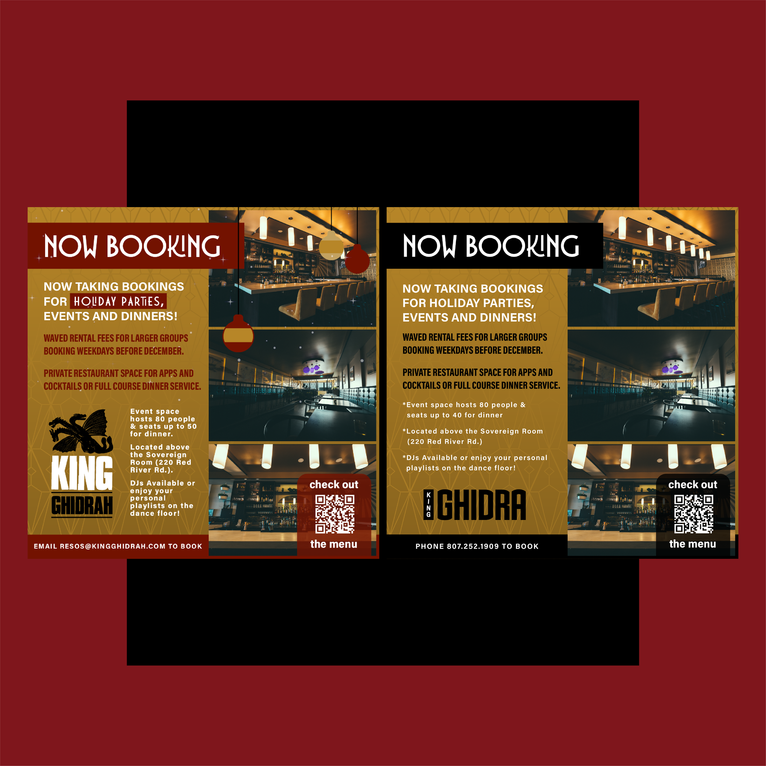 The Challenge: Two connected venues — The Sovereign Room downstairs and King Ghidra above — needed print and collateral materials that each held their own identity while feeling like they belonged to the same building. Menus, gift certificates, event posters, and social graphics all needed to pull their weight across both brands.
